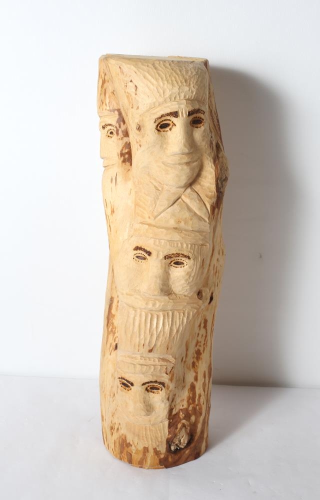 Birkistofn með 5 útskornum andlitum. Úr dánarbúi Sveins Einarssonar frá Hrjót í