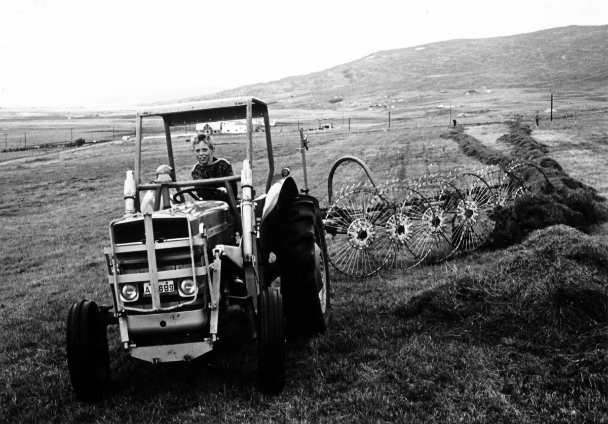 Aðalsteinn f. 1955, að garða. Massey Ferguson 135 A-d 689, og Vicon rakstrarvél. Höskuldsstaðir og Kaupangssveitin í baksýn.