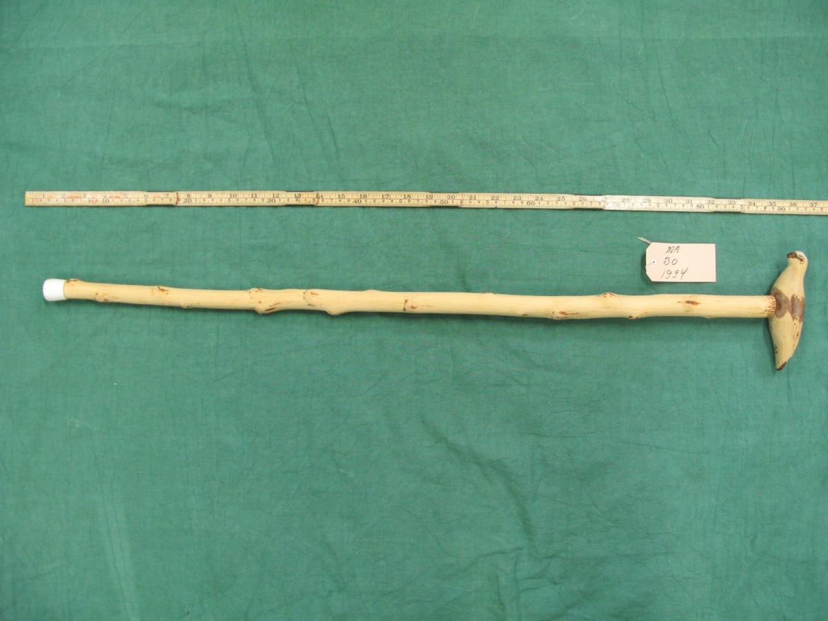 Göngustafur úr grönnum viðarstofni, útskorin rjúpa á handfangi. Smíðaður af föður gefanda.