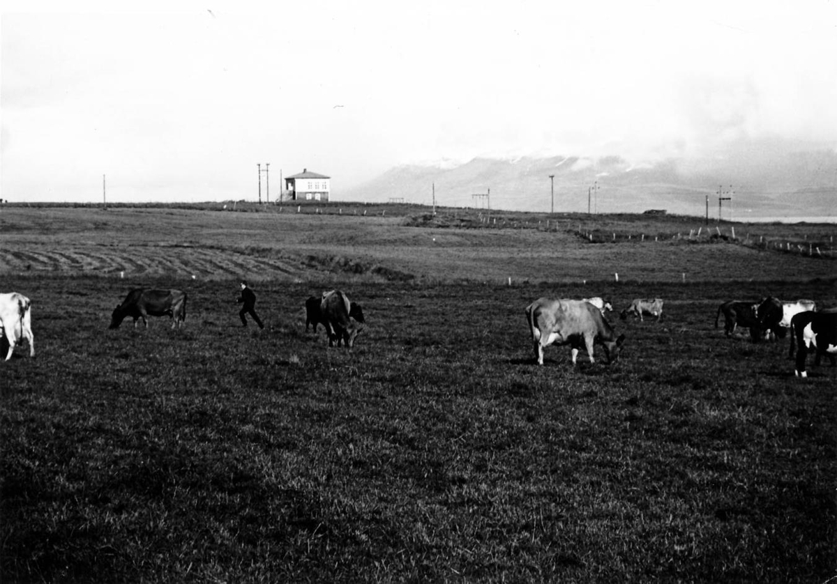 Félagsheimilið Kuðungur Glæsibæjarhreppi. Bóndinn Einars- og Sílastöðum að sækja kýrnar í mjaltir.