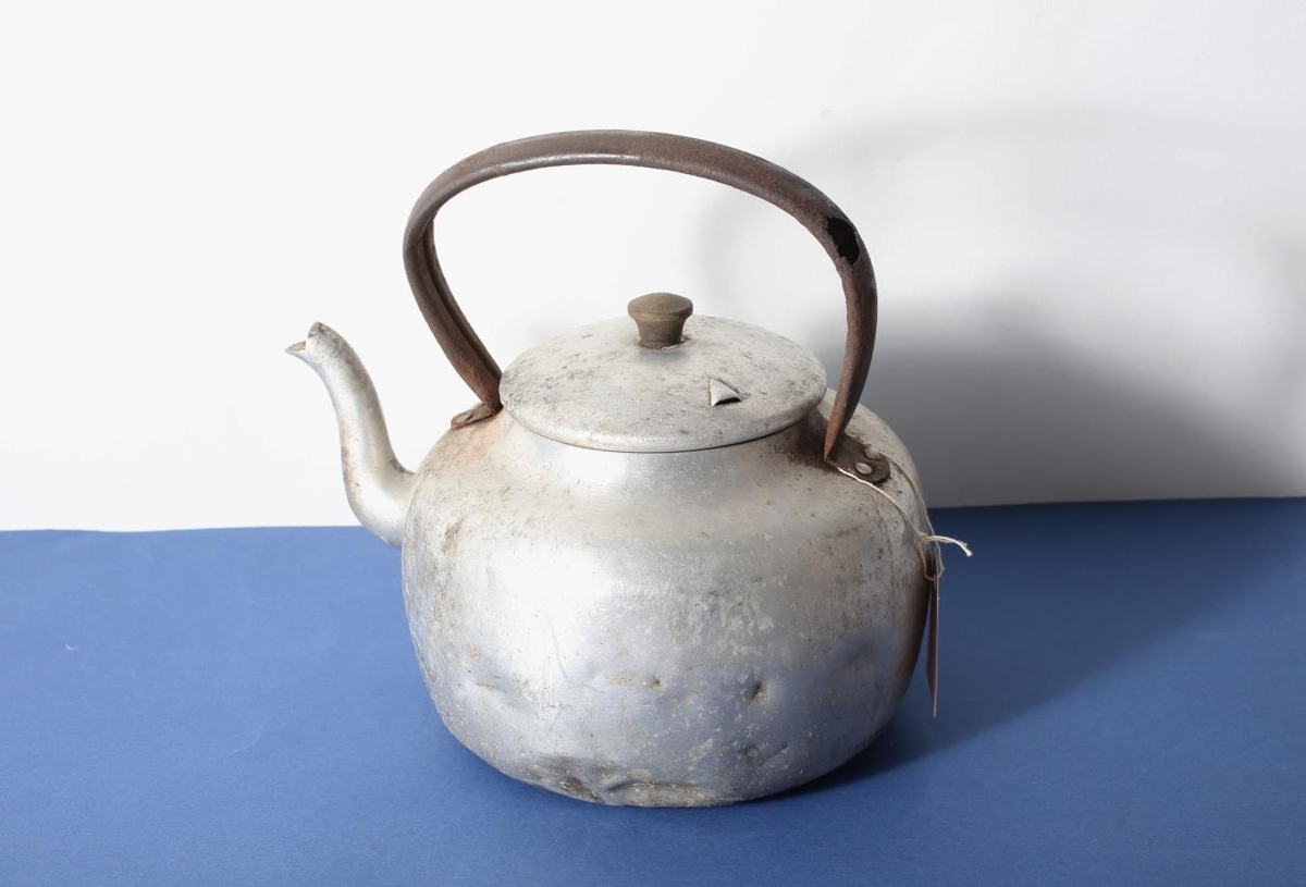 Grár vatnsketill úr áli, með járnhaldi. Úr búi Þorsteins Sigfússonar og Ingibjargar Geirmundsdóttur.