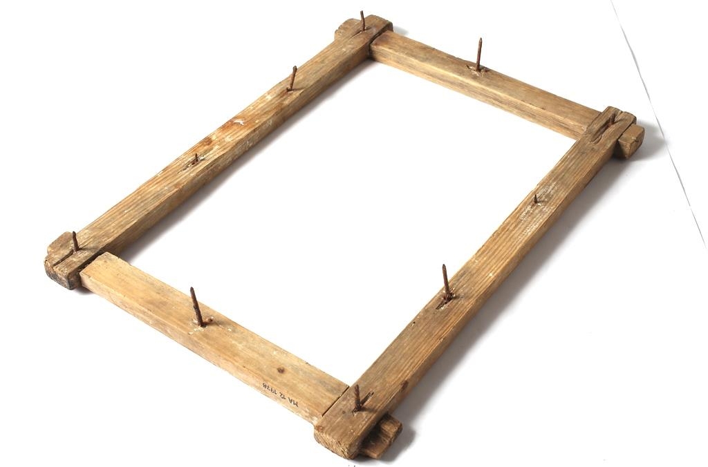 Trégrind felld saman á hornum með járnnöglum til að strekkja tausíu á.