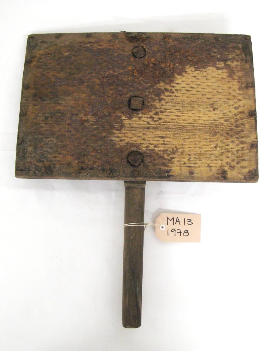 Tré af stórum ullarkambi. Tréskaft tréneglt á tréblökk en á hana hefur verið negld motta með járngöddum. Hún er nú ryðguð og fúnuð burt.