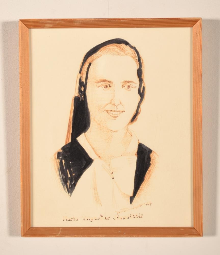 Innrömmuð svart/hvít teikning af Mörtu Valgeði Jónsdóttur