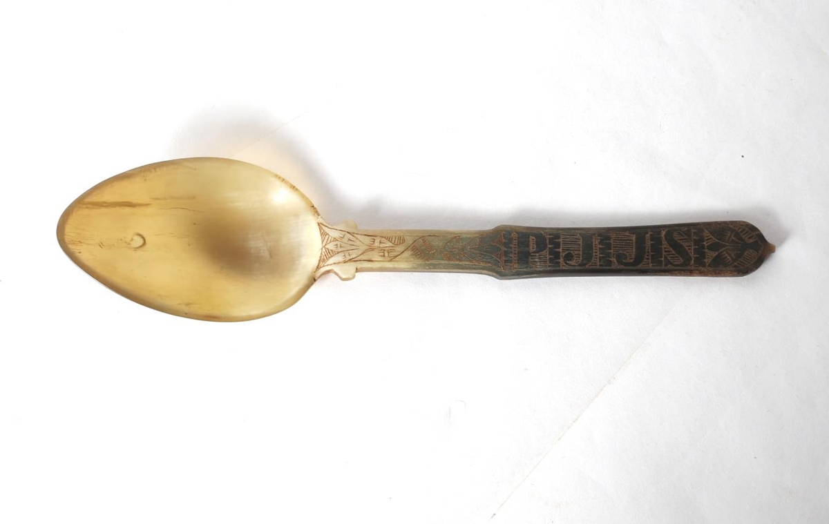Með stöfunum "P.J.J.S.". Úr búi Þorsteins Magnússonar eldri í Höfn (f.01.01.1831 d.03.06.1916) og Önnu konu hans. Þau bjuggu í Höfn frá 1867-1907. Voru langafi og langamma gefanda.