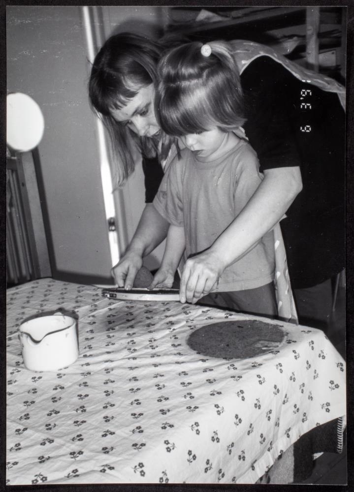 Leikskólabörn búa til pappír. Kona hjálpar lítilli stelpu.