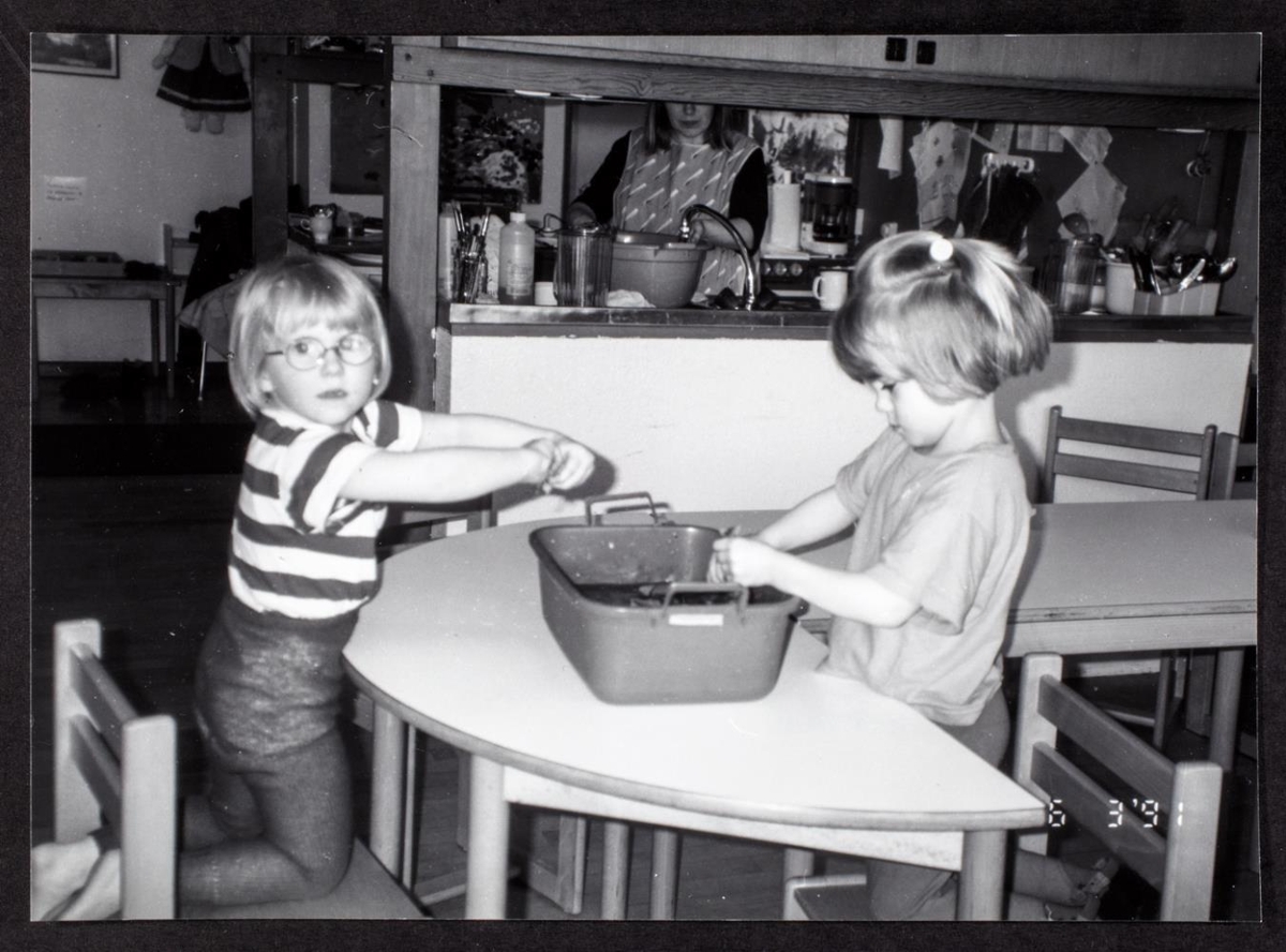 Leikskólabörn búa til pappír. Tvær litlar stelpur með bala á milli sín.