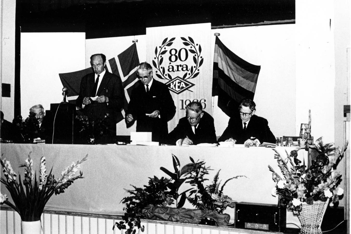 Aðalfundur KEA. Brynjólfur Sveinsson stjórnarform., Stefán Halldórsson fundarstjóri, Gísli Konráðsson fundarstjóri, ?fundarritari og Árni Kristjánsson fundarritari.
