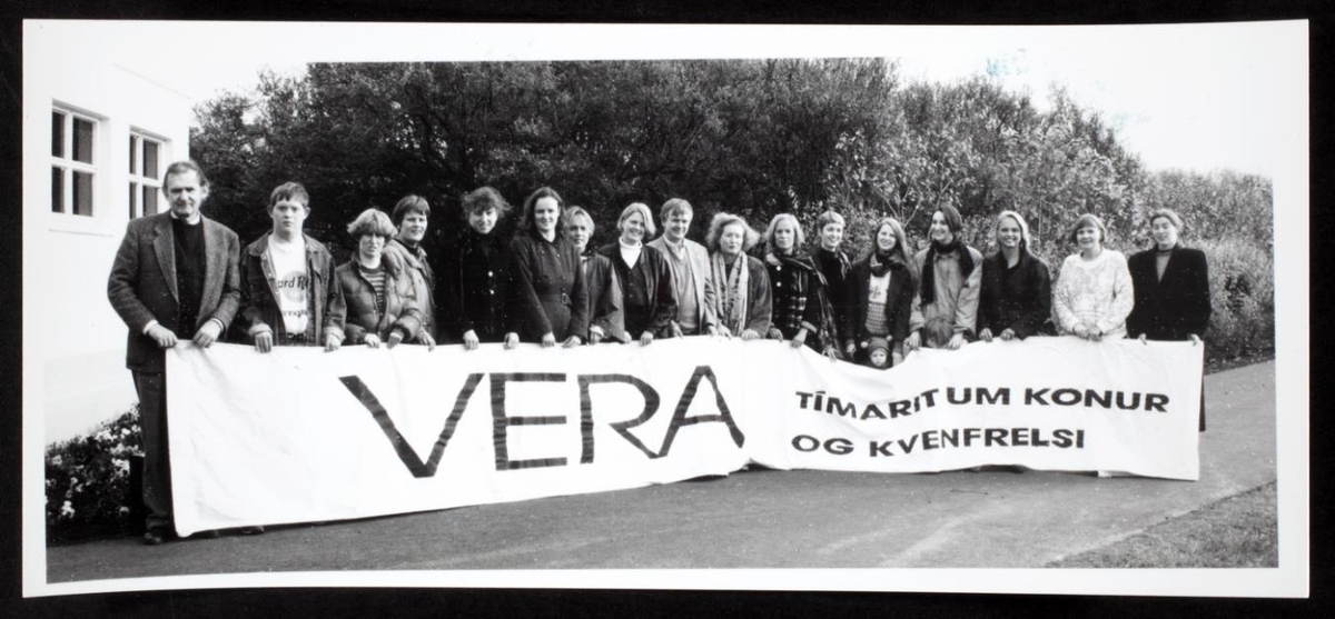 Ritnefnd Veru, vor 1994, og ritstjórar RV og Nh. Tekið úti. Fólk stendur og heldur á stórum borða sem á stendur „Vera tímarit um konur og kvenfrelsi“.