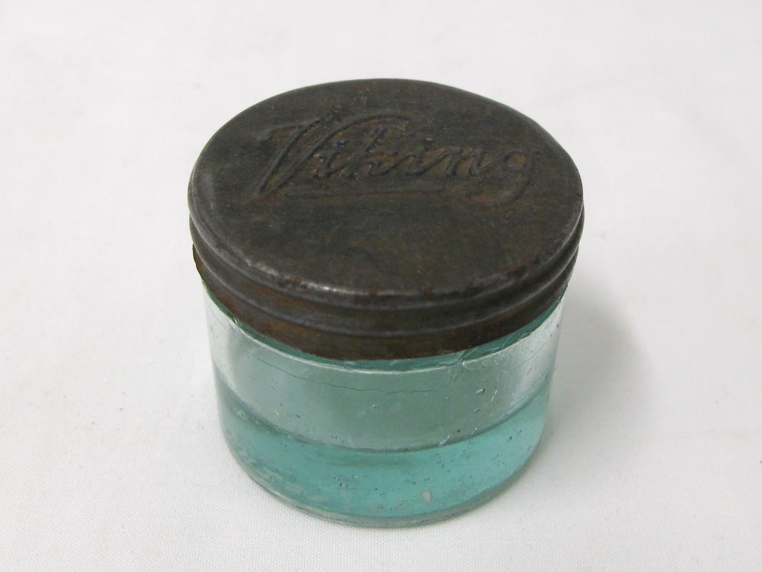 Lítil krukka með járnloki á því stendur: Viking. Krukkan er trúlega undan brillantíni (hárfeiti karlmanna). Úr búi fósturforeldra gefanda, Jakobs Lillendahl og Stígrúnar Stígsdóttur, Akureyri.