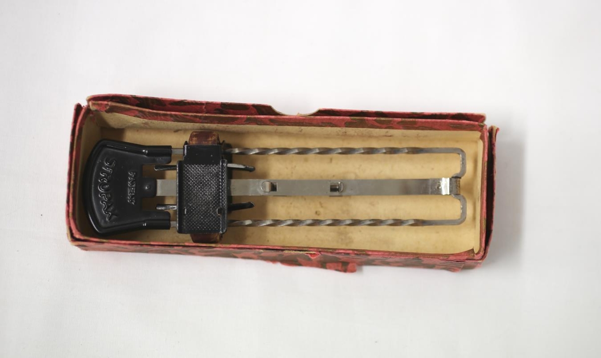 Rakvélablaðsslípari í þar til gerðri öskju. Áletrun: Stropax patent. Úr búi fósturforeldra gefanda, Jakobs Lillendahl og Stígrúnar Stígsdóttur, Akureyri.