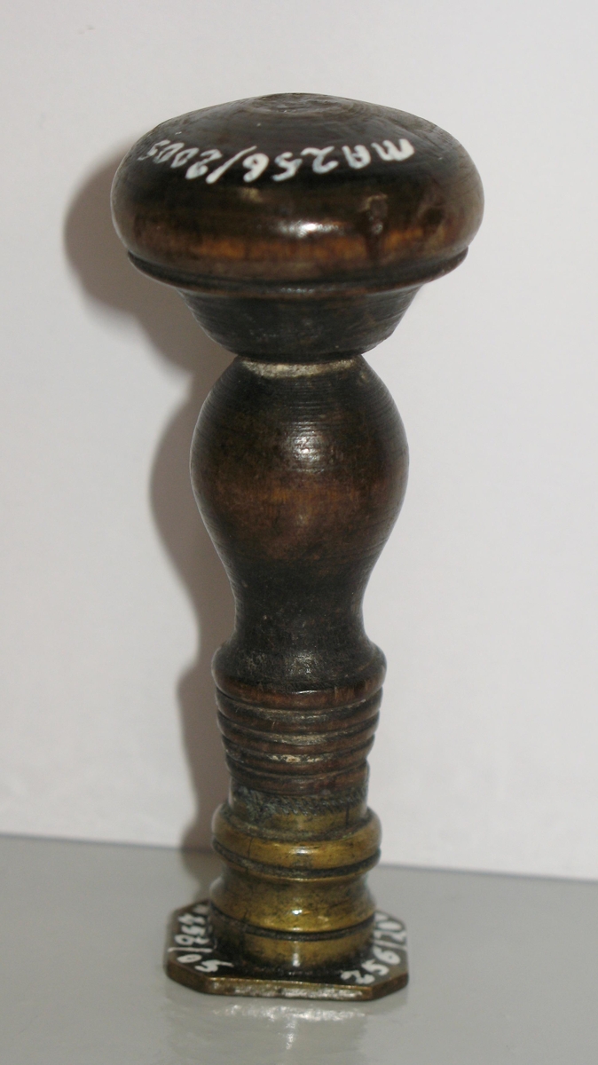 Signet úr látúni, með renndu tréhaldi. Áletrun gæti verið: S.S. (Stígrún Stígsdóttir). Úr búi fósturforeldra gefanda, Jakobs Lillendahl og Stígrúnar