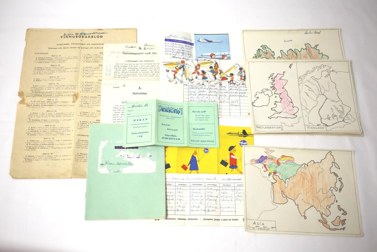 Tíu stykki af ýmsu er varðar barnaskóla s.s. skólaverkefnum, prófum og stundaskrám. Átta teikningar af heimsálfum og löndum, fjórar af heimsálfunum Evrópu, Asíu, Afríku og Ameríku. Fjögur blöð með teikningum af löndunum Noregur/Svíþjóð, Ísland/Færeyjar/Danmörk, Bretland/Finnland og Ísland á einu blaði. Stílabók sem er minningabók. Eitt vinnubókarblað í dýrafræði, líkamsfræði og grasafræði allt á sama blaði. Stafsetningapróf vorið 1951 og annað vorpróf í stafsetningu 1954. Fimm stundaskrár, tvær frá Loftleiðum, ein frá Pelíkan og ein frá Æskunni.