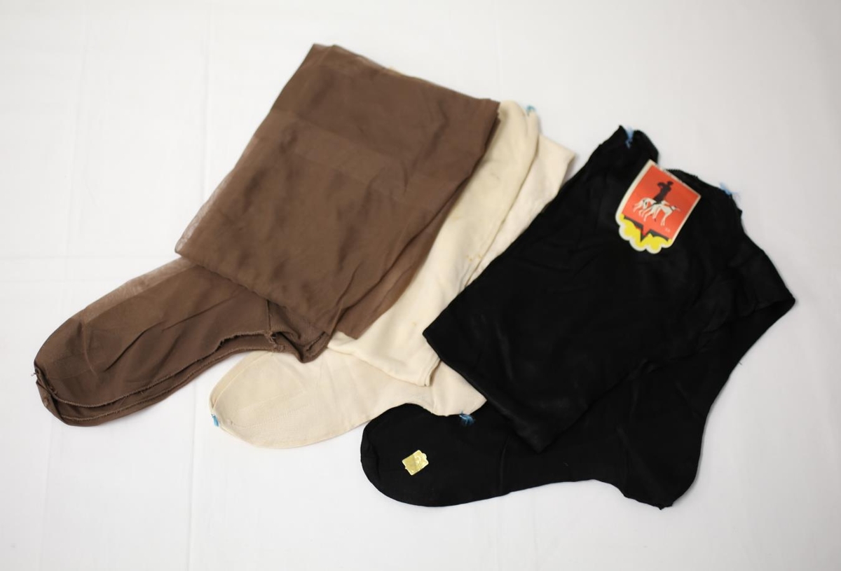 Þrenn pör af silkisokkum sem eru í þremur litum; beis, svartir og brúnir. Sokkarnir eru allir með saum aftan á leggnum. Ljósu sokkarnir eru festir saman með kringlóttum svörtum og rauðum miða sem á stendur "RRA" og er mynd af rúbínsteini í miðju og neðan undir honum stendur "Rrubino". Á leistanum er skrifað með gylltu "Bemberg Extra". Svörtu sokkarnir eru festir saman með rauðum, hvítum og svörtum miða sem á er mynd af svartri konu með tvo hvíta hunda. Gyllt merki er á leistanum sem á stendur "9 1/2". Brúnu sokkarnir eru teknir í sundur.