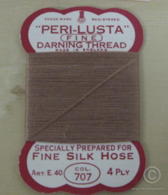 Spjald með brúnum þræði sem notaður var til að stoppa í silki-sokka. Spjaldið er hvítt með rauðum stöfum sem á stendur "Peri-Lusta Fine darning thread. Made in England. Specially Prepered for fine silk hose."