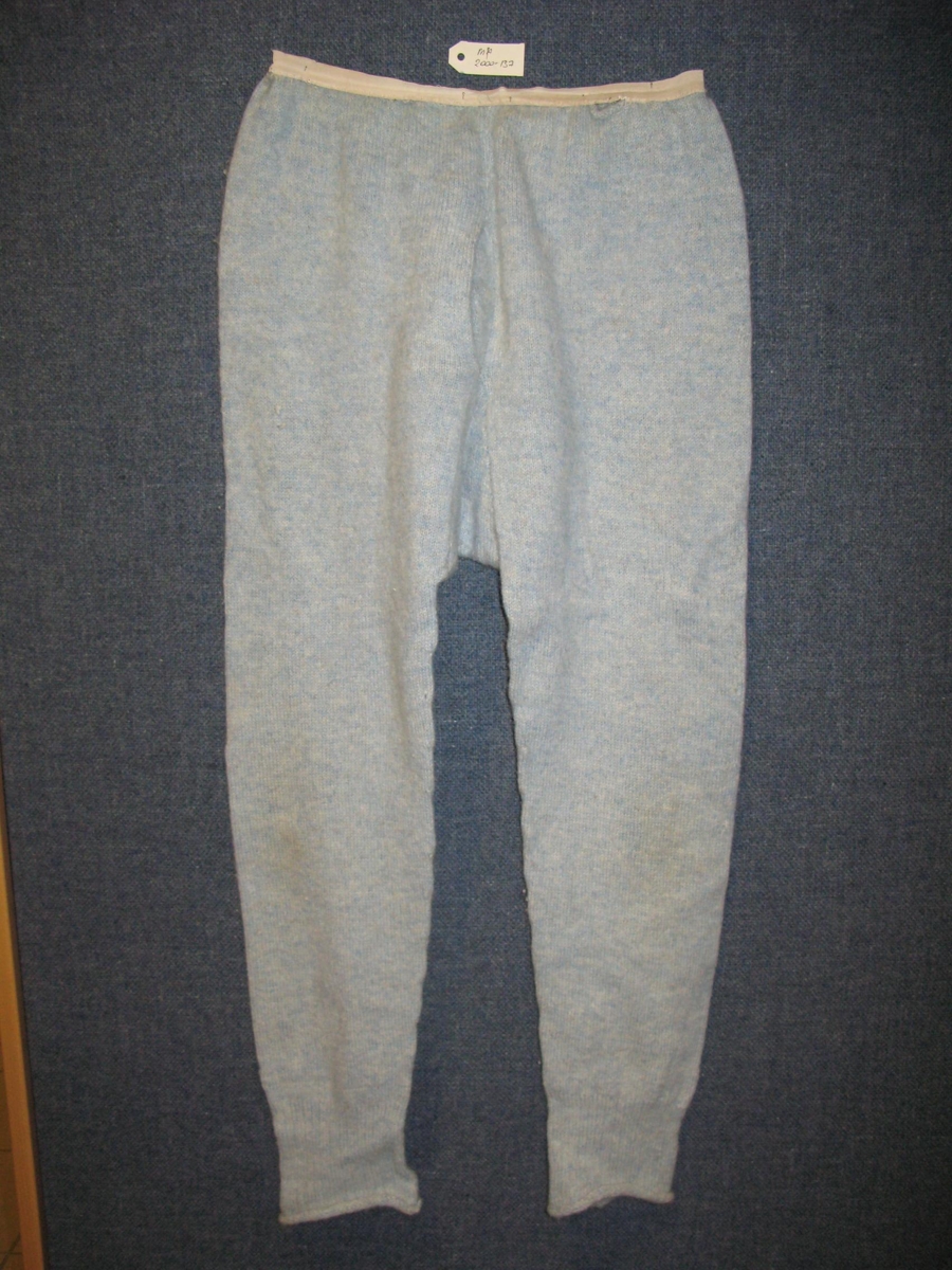 Bláar, prjónaðar, síðar ullarbrækur á fullorðinn. Úr búi Sigrúnar Guðmundsdóttur og Ármanns Jónssonar, bænda á Vaði í Skriðdal.