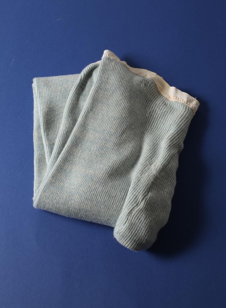 Síðar ullarbrækur úr fínni, ljósri, blágrænni ull. Heillegar með teygju í mittið og merkimiða sem á stendur: "DRÖFN". Stærð 54. Koma úr búi Sigrúnar Guðmundsdóttur og Ármanns Jónssonar, bænda á Vaði í Skriðdal. Annað heiti: Föðurland.