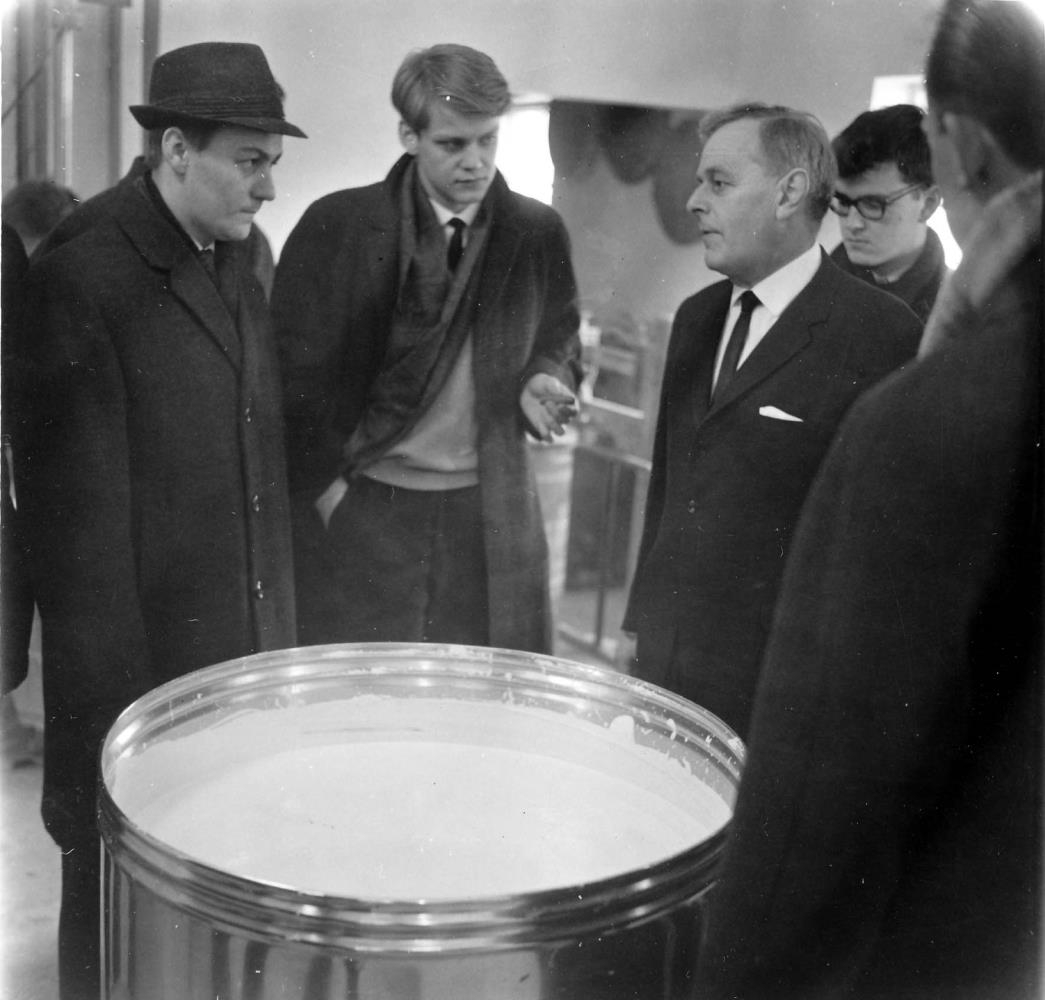 Ragnar Ólafsson aðstoðarforstjóri kynnir málningar framleiðslu Sjafnar. Og maður reykir vindil.