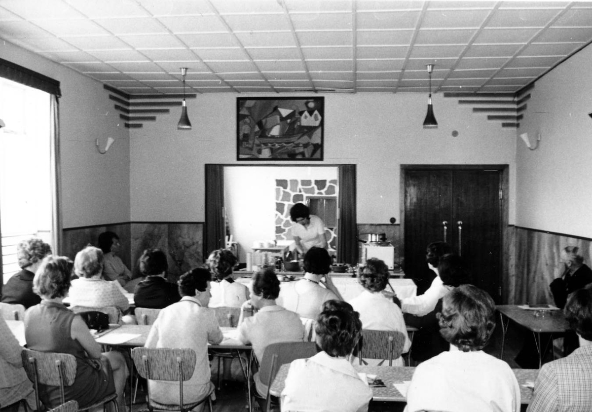 Húsmæðrafundur á vegum KEA og SÍS, Bryndís Steinþórsdóttir leiðbeinir við matreiðslu ýmissa rétta. Slíkir fundir voru haldnir með öllum deildum félagsins.