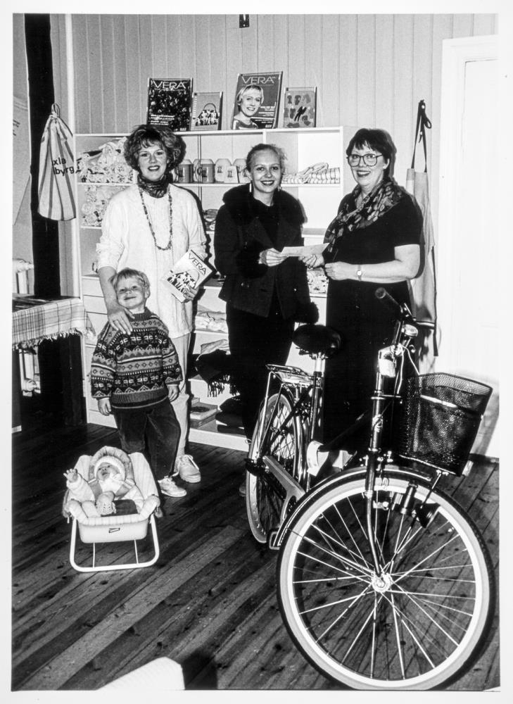 Vera - Happdrætti 1994. Kona afhendir tveimur konum vinninga. Strákur og ungabarn.