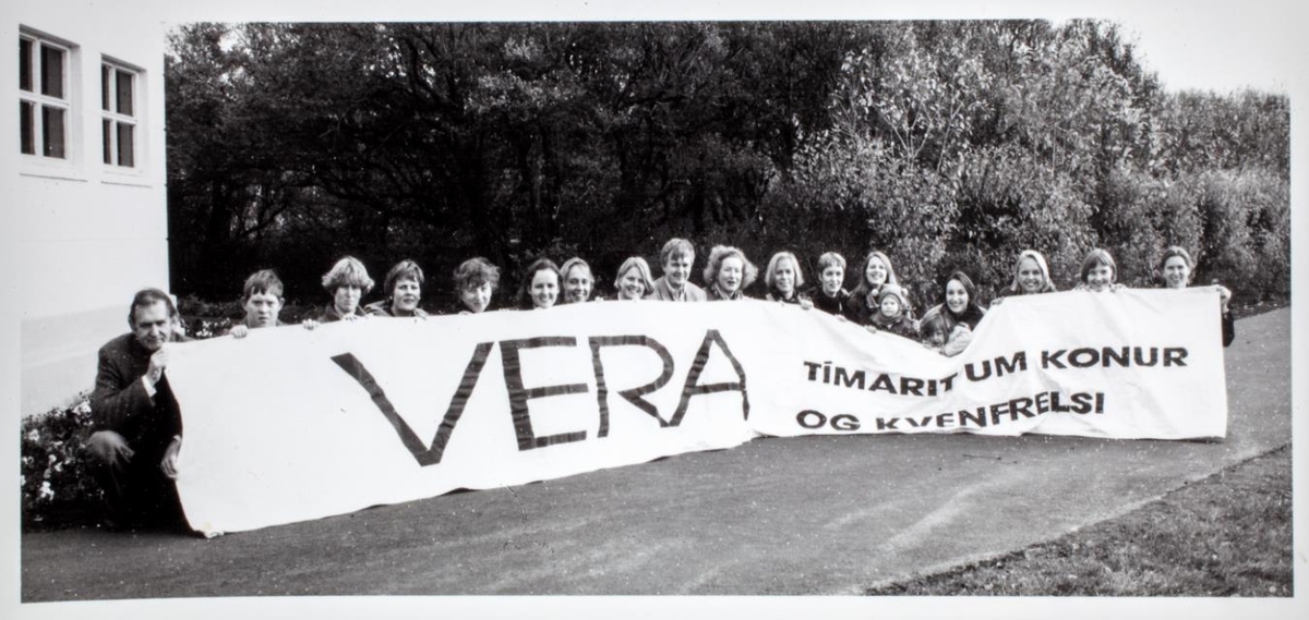 Vera - Konurnar á bak við Veru, haust 1992. Fólk stendur og heldur á stórum borða sem á stendur „Vera tímarit um konur og kvenfrelsi“.