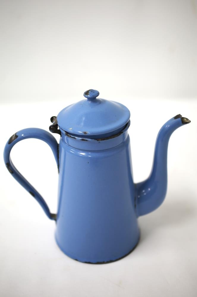 Blá, emeleruð kaffikanna, mikið notuð. Talsvert brotið úr. Úr búi foreldra Huldu Jónsdóttur á Freyshólum. Frá því um 1925-27.