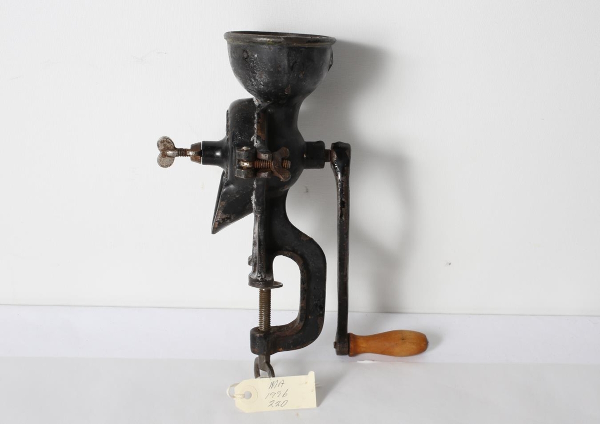 Svört kaffikvörn til að festa á borð. Á hliðinni stendur "Husqvarna no. 4A, Made in Sweden." Úr Freyshólabúinu frá því um 1945-1950. Móðir Huldu fékk hana að gjöf frá Guðrúnu Ketilsdóttur, ekkju Guðjóns Jónssonar, snikkara, ömmubróður gefanda.