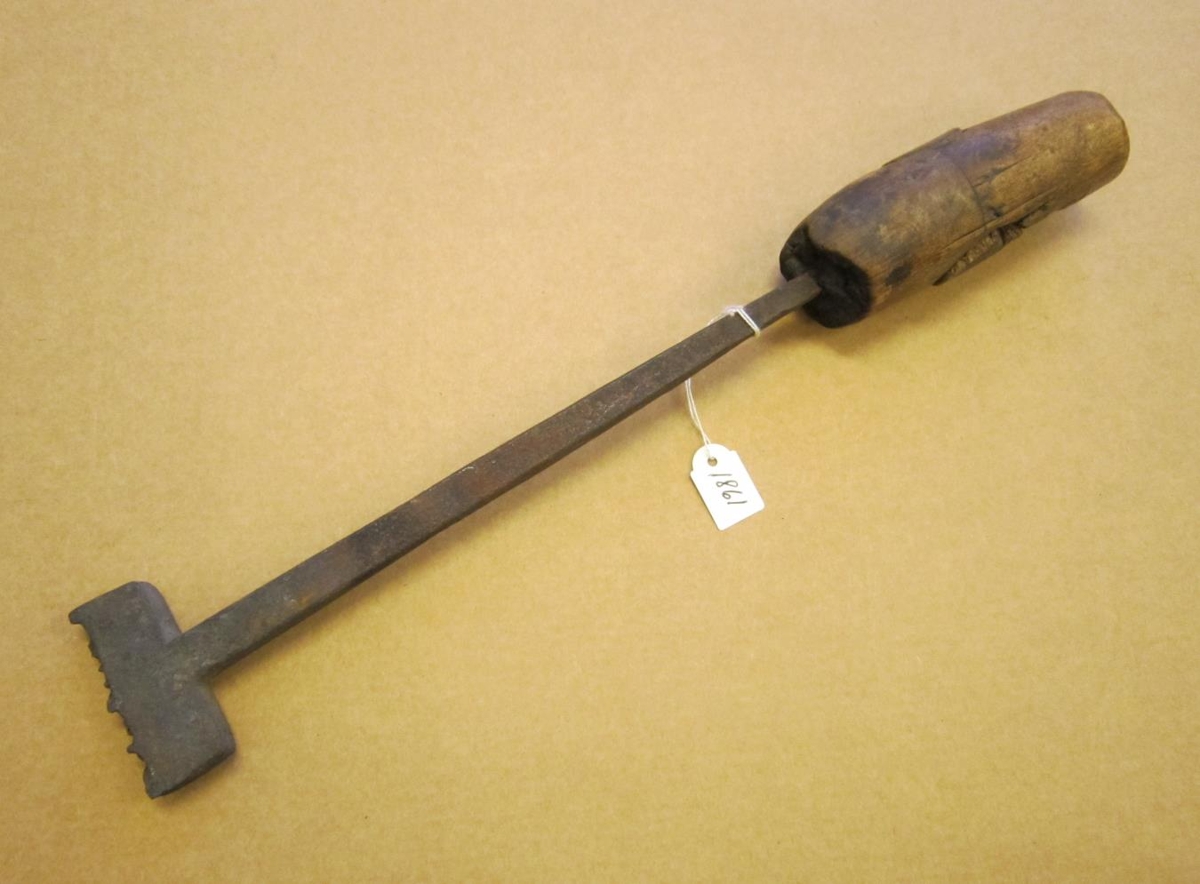 Brennimark úr eigu Þórðar Jónssonar (f. 17.2.1885, d. 5.7.1961), Skallagrímsgötu 5, Borgarnesi. Á því stendur Þórður J. og það er 32,5 cm á lengd með tréhaldi.