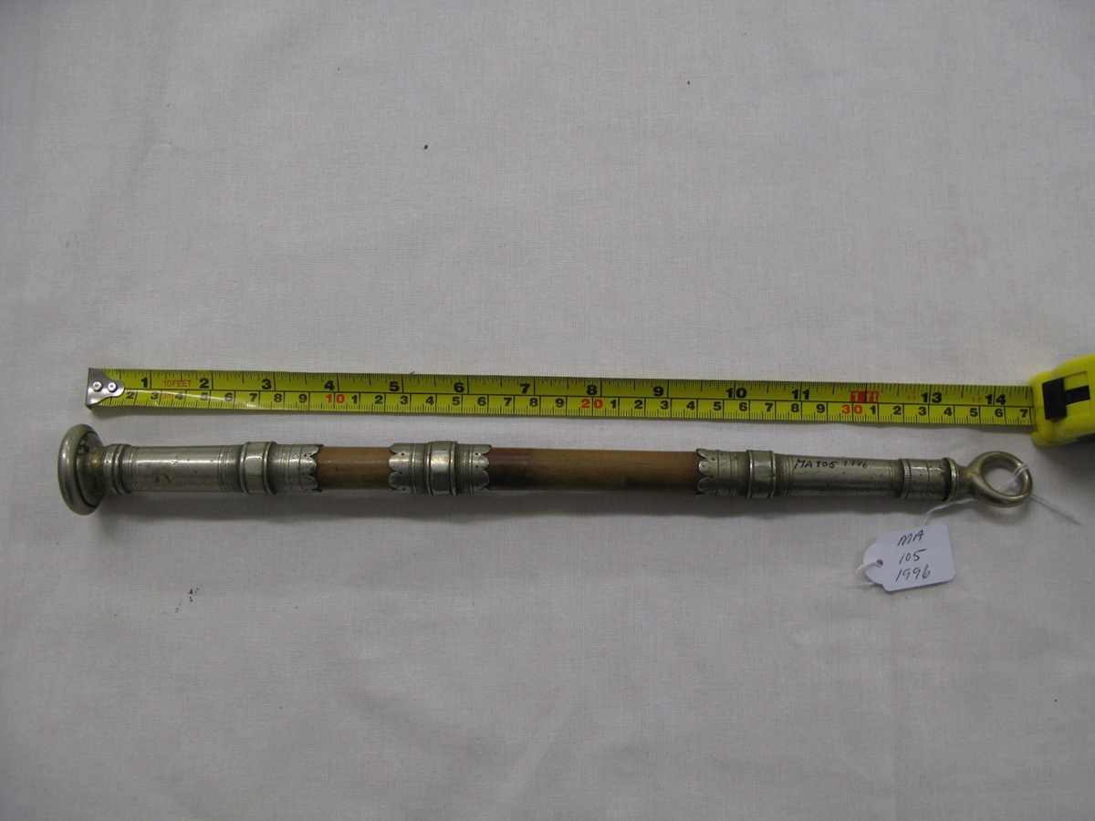Silfurbúin svipa, laufuð og áttkantað mynstur á milli. Úr eigu föður gefanda, Jóns bónda á Freyshólum.