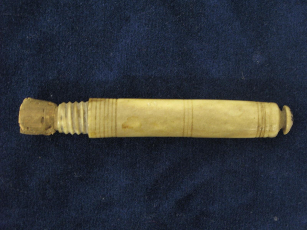 Rennt úr hreindýrshorni, vantar lokið. Korktappi, illa farinn.