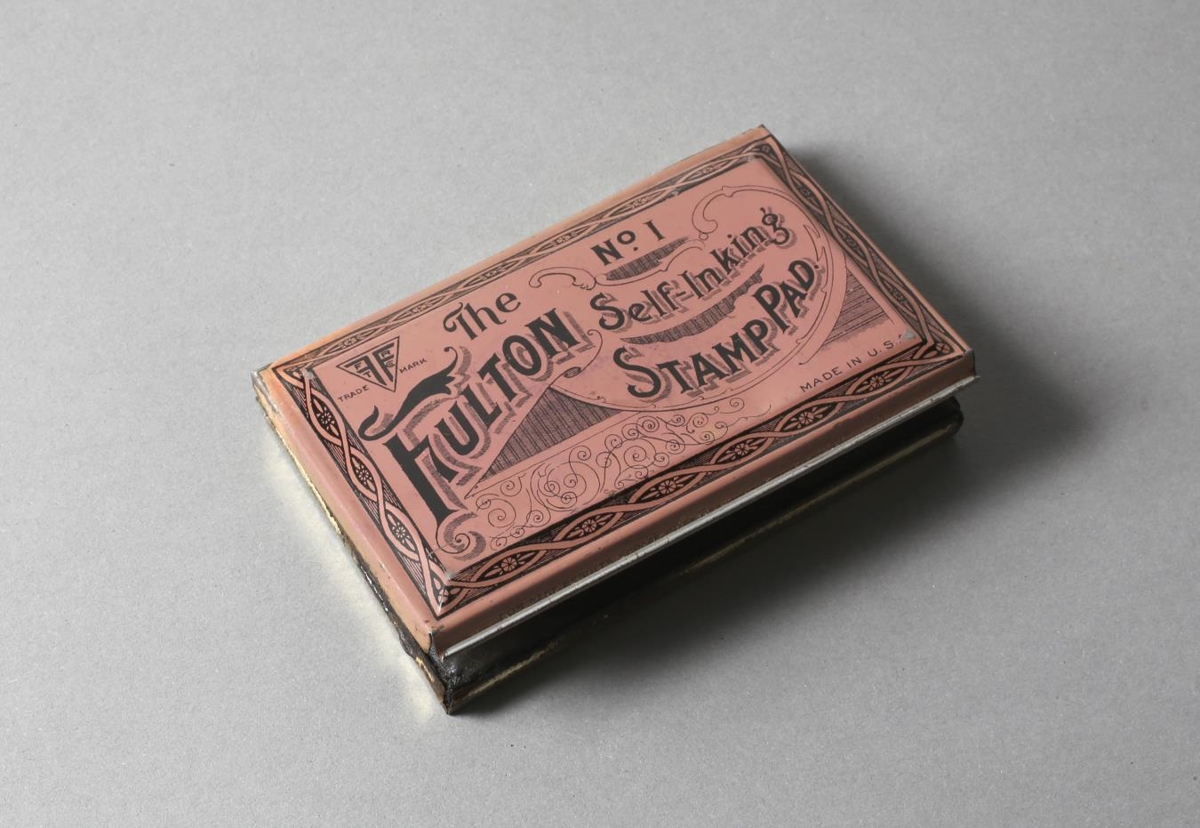 Blekpúði í járnkassa með bleiku loki sem á stendur "The Fulton self Inking Stamp Pad. No.1. Made in U.S.A.". Úr búi Guttorms Pálssonar, skógarvarðar á Hallormsstað (f.12.07.1884, d.05.06.1964).