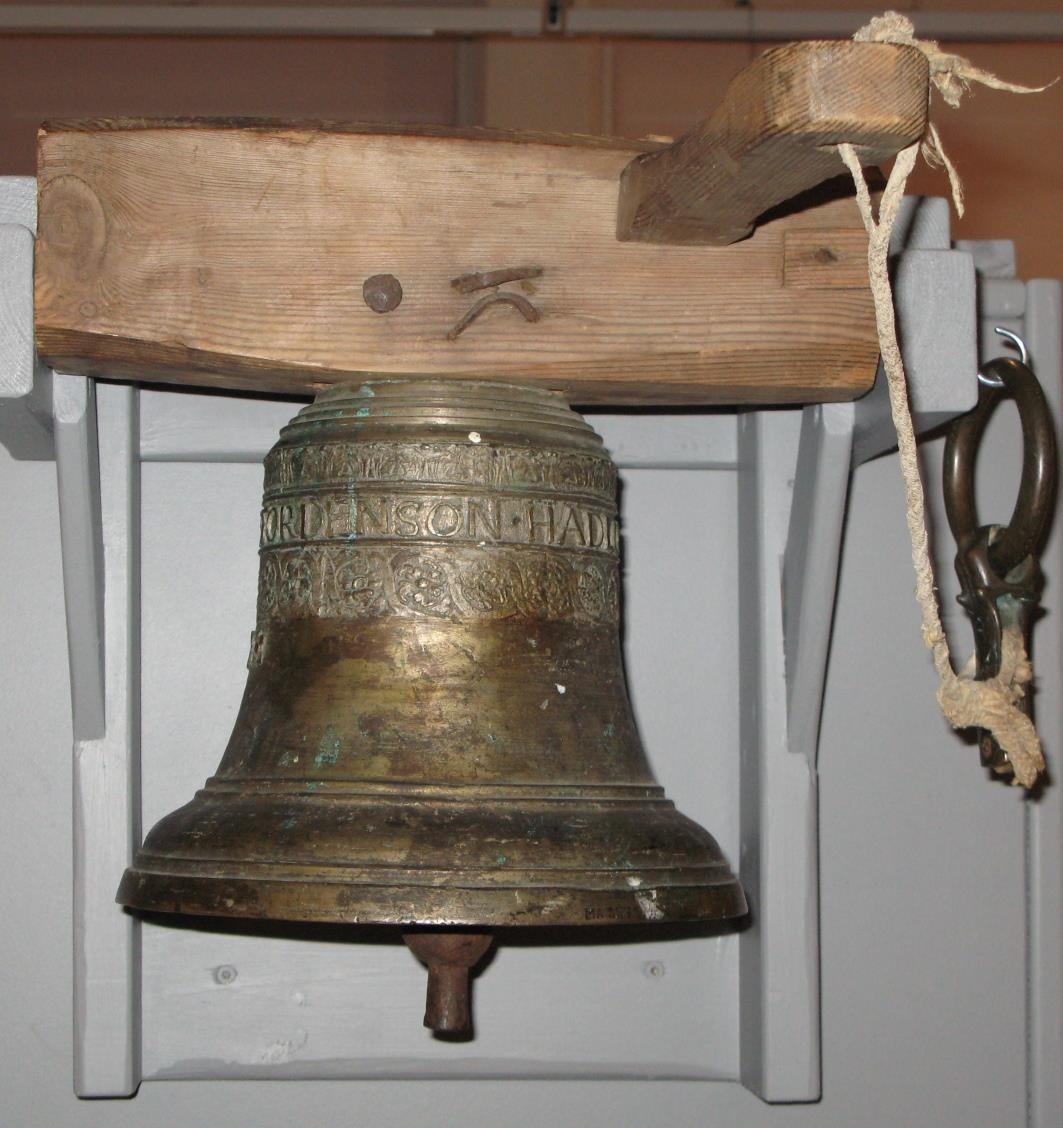 "Yfir söngloptinu hangir kirkjuklukkan úr kopar með þessari áletrun: H=HIERLEIWER TORDENSSON HADLORUM (umhverfis efst) STAED: ANNO 1739 á kápu). Nýleg enn að sjá. Lagið venjulegt. Hringt til útgöngu."