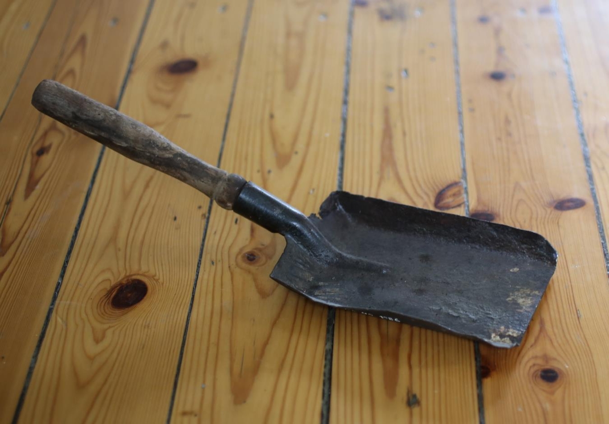 Kolaskófla með tréhandfangi, til að moka kolum í vél. Úr búi Sigrúnar og Benedikts Blöndal þegar þau bjuggu í Mjóanesi.