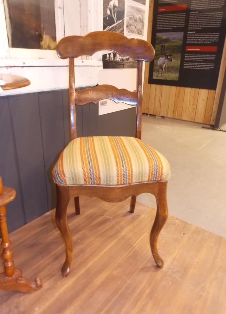 Fjórir borðstofustólar með ofnu áklæði. Áklæðið óf Arnþrúður Gunnlaugsdóttir tengdadóttir Guttorms Pálssonar, skógarvarðar á Hallormsstað (f.12.07.1884 d.05.06.1964).