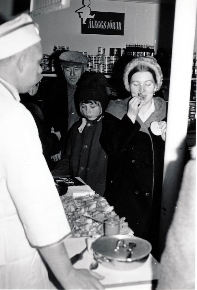 Einar Sigurðsson deildarstjóri Kjötiðnaðarstöðvar að kynna þorramat í einni kjörbúðinni.