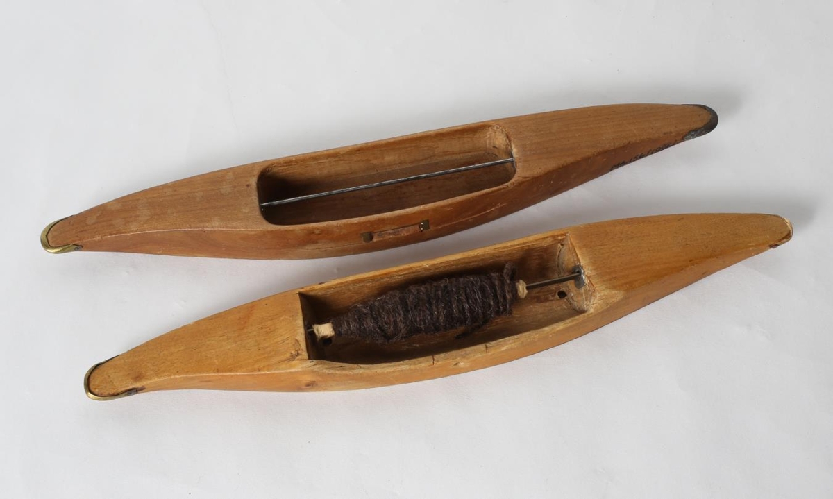 Tvær skyttur úr eigu Guðrúnar Pálsdóttur, seinni konu Guttorms Pálssonar frá Hallormsstað. Önnur skyttan er með spólu í. Hún sótti námskeið í vefnaðarfræðum um miðjan þriðja áratuginn á lýðskólanum í Hilleröd.