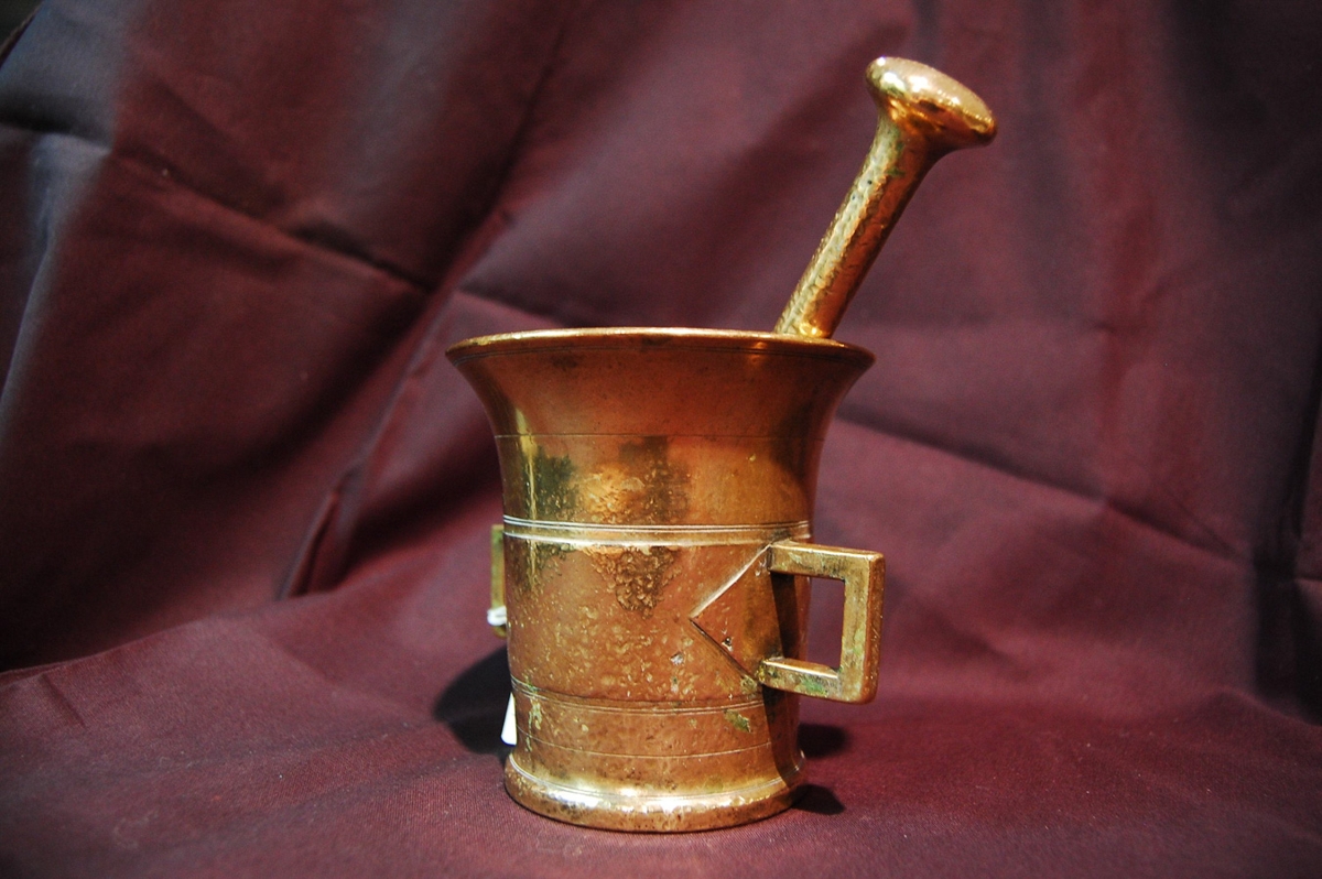 Lítið mortél úr messing með tveimur höldum og stauturinn sem fylgir er líka úr sama efni. Úr búi Guttorms Pálssonar, skógarvarðar á Hallormsstað (f.12.07.1884 d.05.06.1964).