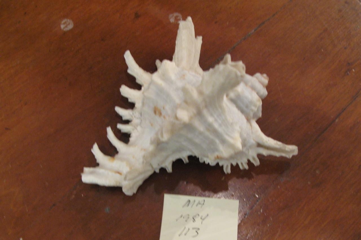 Hvítur erlendur kuðungur, stór og kræklóttur. Notaður sem öskubakki. Úr búi Guttorms Pálssonar, skógarvarðar á Hallormsstað (f.12.07.1884, d.05.06.1964).