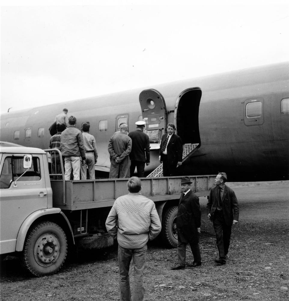 "Flugvélin er Douglas DC-6B TF-OAA og er annað hvort á vegum Fragtflugs hf (1970 til 1973) eða Íscargo.hf. Fimmti maður frá vinstri á palli vörubílsins er Hallgrímur Jónsson flugstjóri." (PPJ 2022)