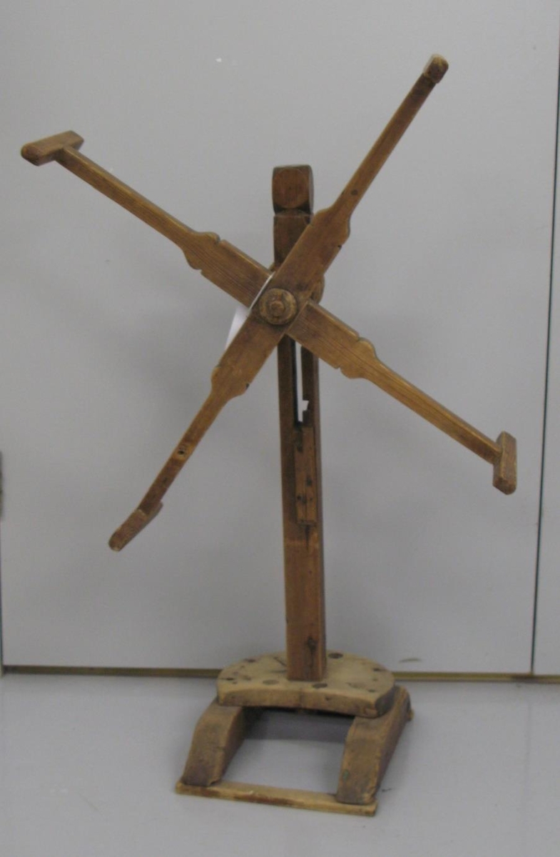 Gamalt og fremur klossað hesputré. Notað til að hespa upp garn. Heimatilbúið.