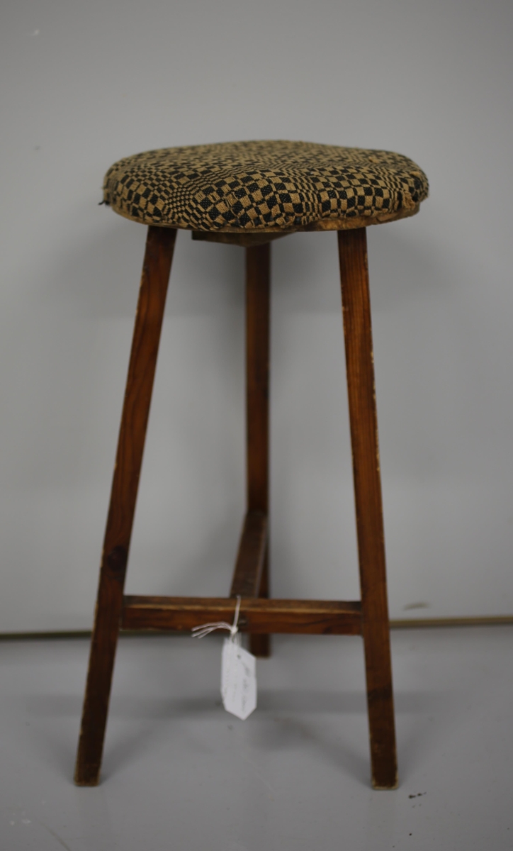 Hár stóll með kringlóttri setu, bólstraðri með heimaofnu áklæði. Stendur á þremur fótum. Fylgir prjónavélarskápnum nr. MA-2005-260.