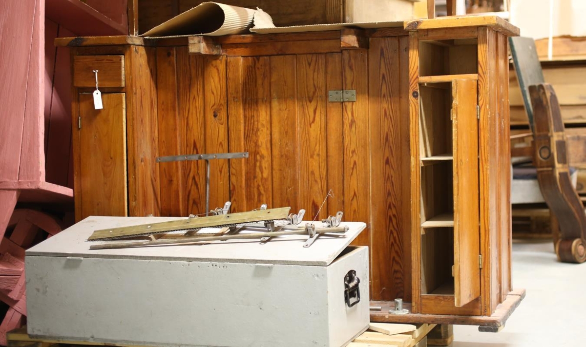 Skápur til að festa prjónavél á. Tvær skúffur hvor til sinnar handar og skápar undir. Einnig skápur í miðju. Notað undir prjónavél og fylgihluti. Fylgdi prjónavél nr. MA-2005-259.