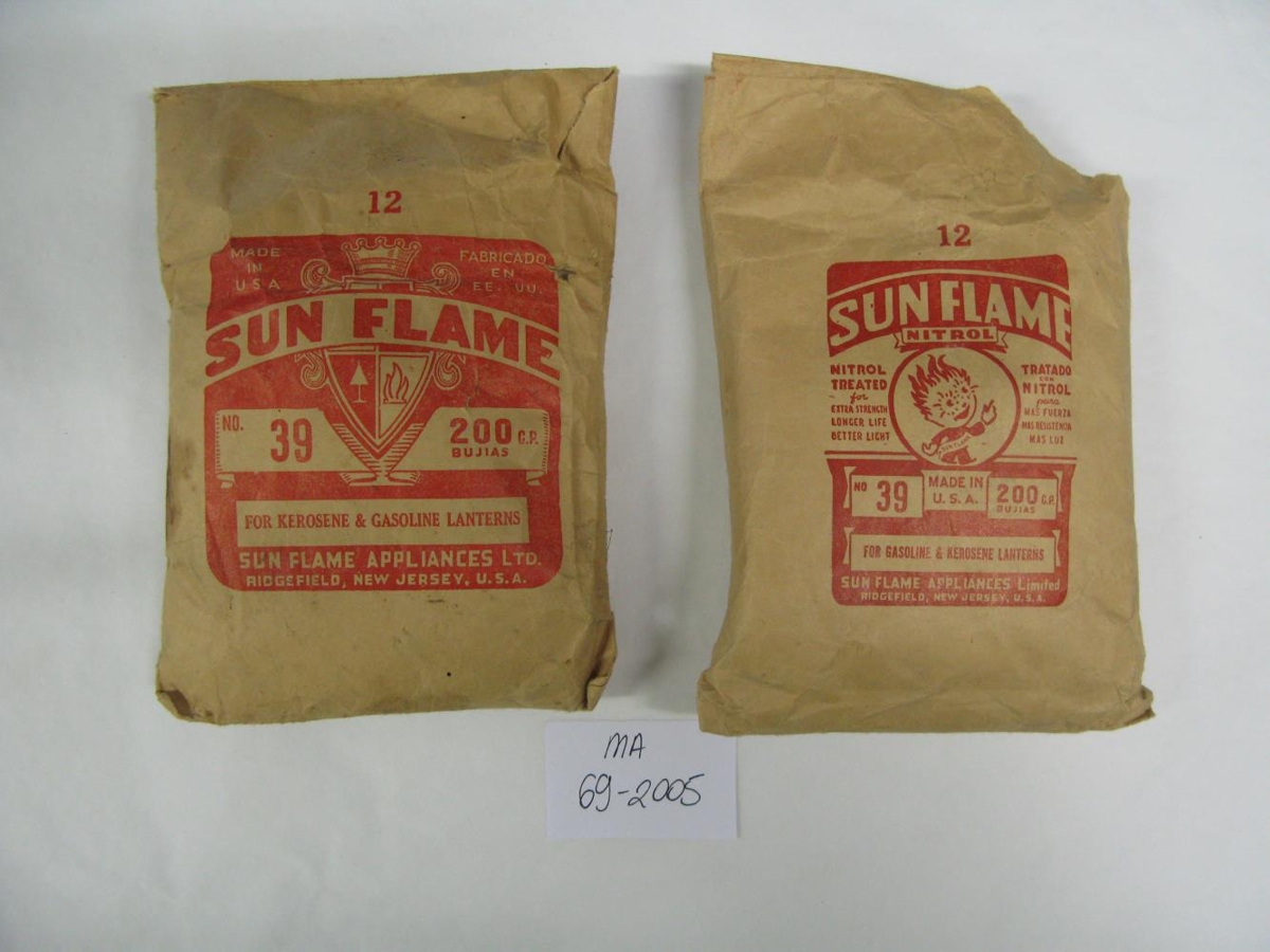 Tveir pokar með luktarnetum (12 stk x 2) no 39. Fylgihlutur með gaslukt. Made in U.S.A. Úr búi Þórnýjar Friðriksdóttur og Hrafns Sveinbjarnarsonar, Hjalla Hallormsstað. Sigrún dóttir þeirra seldi húsið árið 2005 og flutti til Egilsstaða.