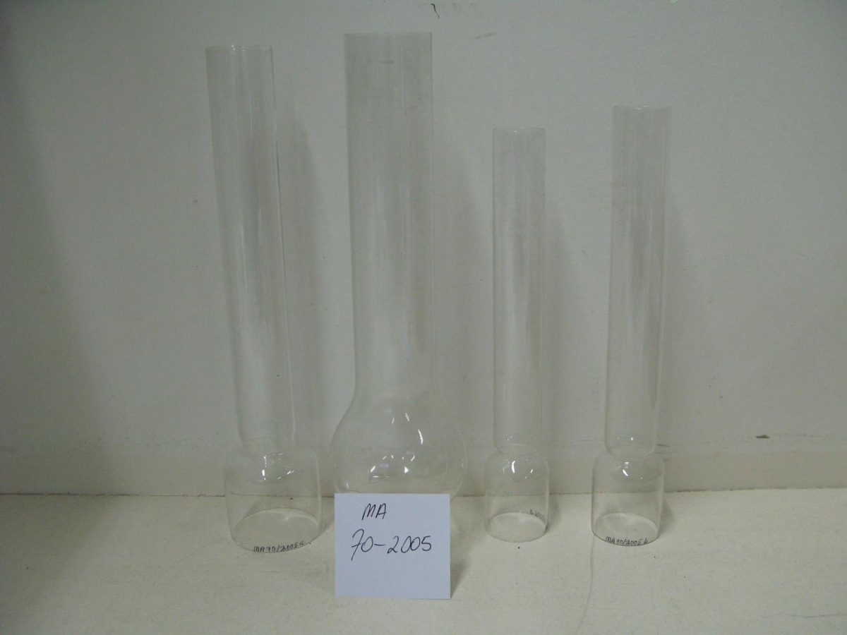 Fjögur glær lampaglös. a) 8´´´ Kosmos, hæð 21,2 cm. b) 10 ´´´ Cristal, hæð 22,4 cm. c) hæð 25,5 cm. d) (kúlulaga neðst) hæð 25,7 cm. Fylgihlutir með lömpum. Made in Germany. Úr búi Þórnýjar Friðriksdóttur og Hrafns Sveinbjarnarsonar, Hjalla Hallormsstað. Sigrún dóttir þeirra seldi húsið árið 2005 og flutti til Egilsstaða.