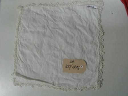 Hvítur, sléttur dúkur með útflúruðum útlínum. Gjöf frá heimili Steinþórs Eiríkssonar og Þórunnar Þórhallsdóttur, Hjarðarhlíð 1, Egilsstöðum.