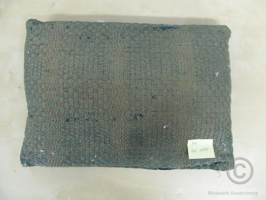 Framhlið púðans er munstruð græn og brún, bakhlið svört með fíngerðu brúnu munstri. Púðinn er fylltur með fiðri. Gjöf frá heimili Steinþórs Eiríkssonar og Þórunnar Þórhallsdóttur, Hjarðarhlíð 1, Egilsstöðum.