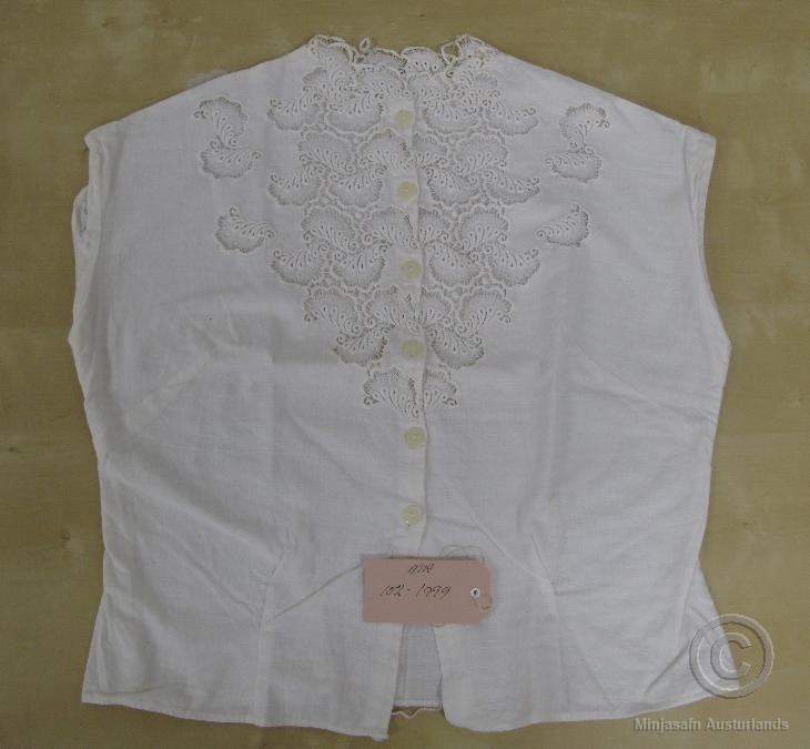 Hvít kvenskyrta, munstruð að framan. Gjöf frá heimili Steinþórs Eiríkssonar og Þórunnar Þórhallsdóttur, Hjarðarhlíð 1, Egilsstöðum.