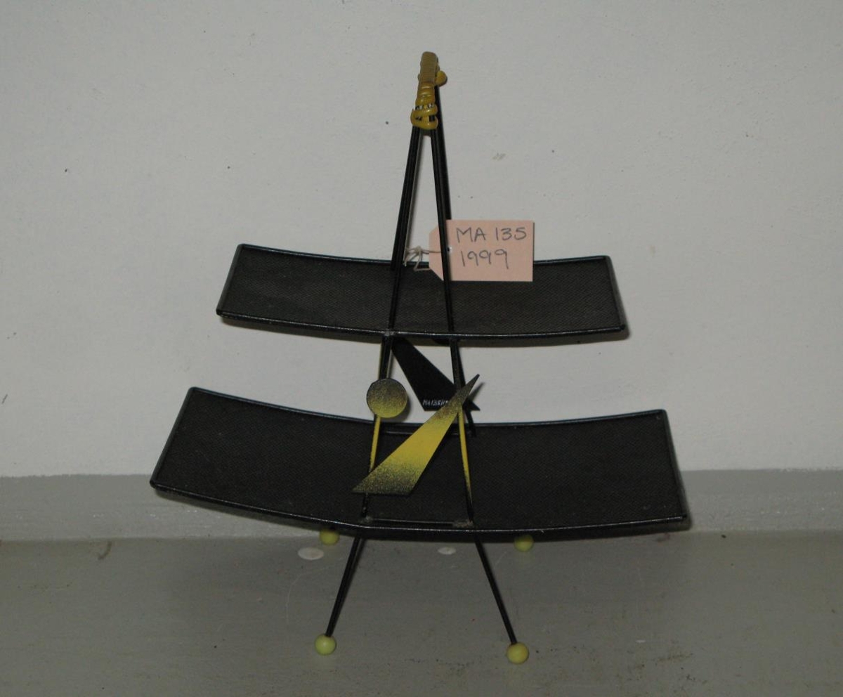 Svartur kökubakki úr járni á tveimur hæðum með gulu skrauti á uppistöndurum, gulum plastkúlum á fótum og haldið efst er vafið með gulu plasti sem farið er að rakna upp. Gjöf frá heimili Steinþórs Eiríkssonar og Þórunnar Þórhallsdóttur, Hjarðarhlíð 1, Egilsstöðum.