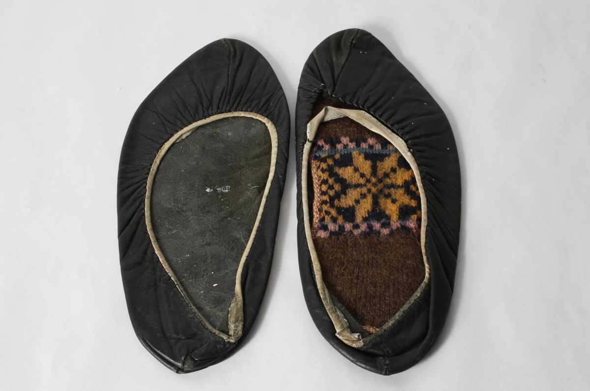 Par af svörtum leðurskóm. Í öðrum skónum er prjónaður ullarleppur, brúnn að lit með gulu munstri. Gjöf frá heimili Steinþórs Eiríkssonar og Þórunnar Þórhallsdóttur, Hjarðarhlíð 1, Egilsstöðum.