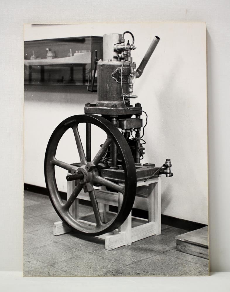 Svart/hvít ljósmynd af vél sem varðveitt er í Þjóðminjasafni Íslands. Myndin er límd á krossvið. Gefandi færði tengdaföður sínum, Steinþóri Eiríkssyni (d.1998) myndina að gjöf.
